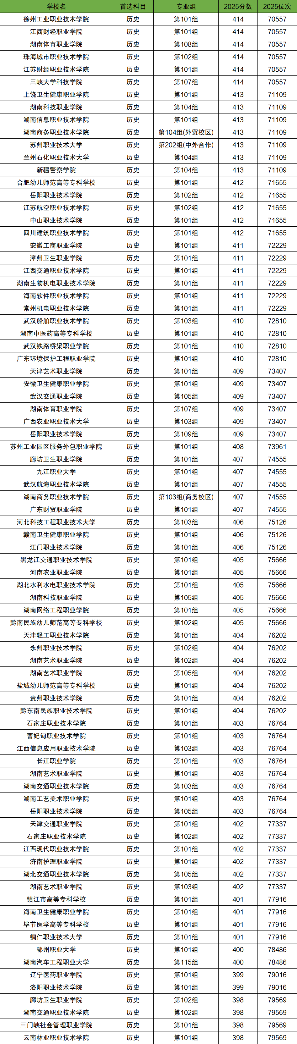 在7-8万名之间的历史类考生能上的学校有71所,对应的分数为414分~398分,对应位次为70557~79569位。