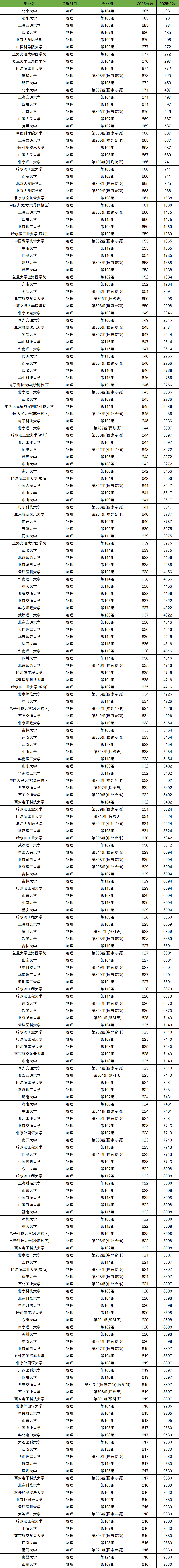 了解各大学在湖南招生录取位次很重要,根据湖南省2025年全国大学录取分数线可知,在1万名之前的物理类考生能上的学校有71所,分数最高为北京大学、清华大学、上海交通大学、武汉大学、北京大学医学部等。