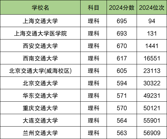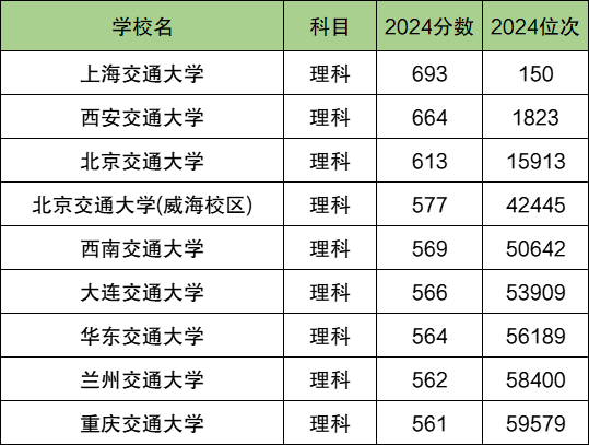 而其他录取分数较低的一本交通院校则有兰州交通大学(562分)、华东交通大学(564分)、大连交通大学(566分)等院校。