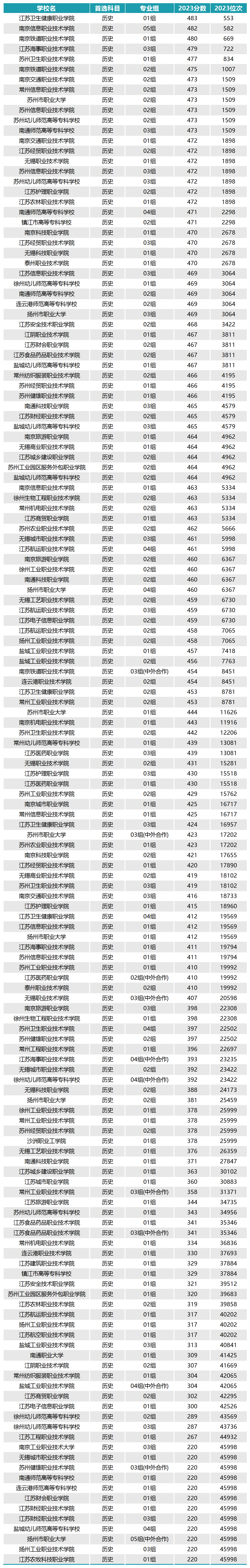 2023年江苏历史类公办专科学校录取分数线一览表如下。