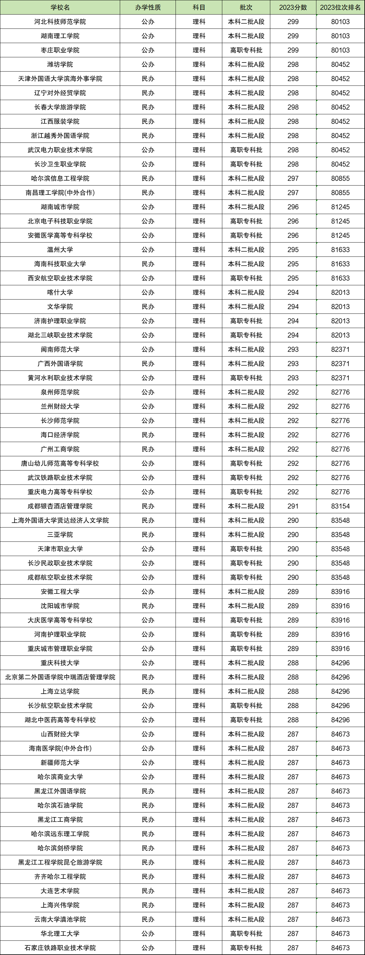 在8万-8.5万位的范围内,最高位次对应的大学是河北科技师范学院、湖南理工学院、枣庄职业学院,最低录取位次为80103位,位次对应分数为299分;