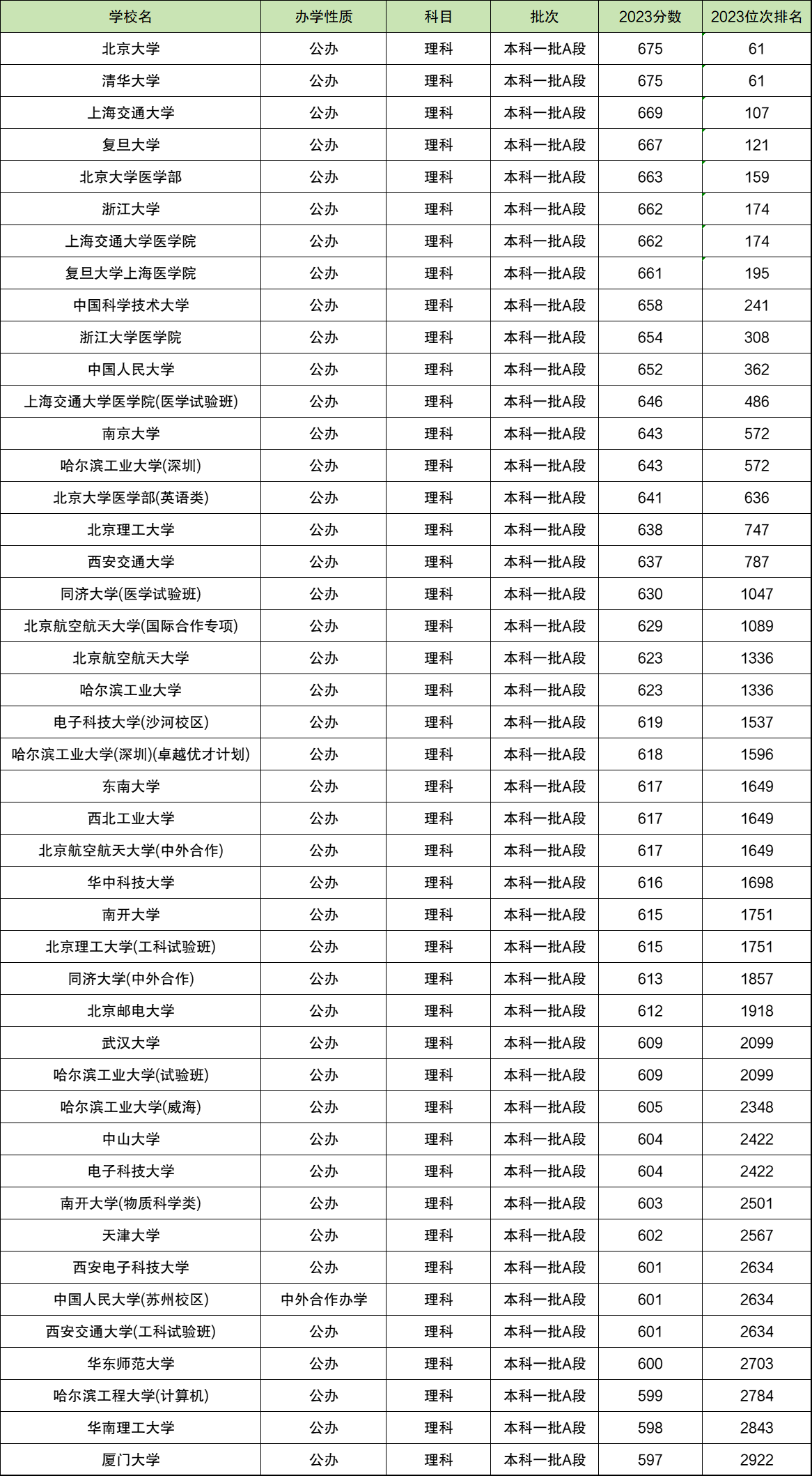 在1-3000名范围内,最高排名对应的大学是北京大学和清华大学,最低录取排名为61位,排名对应分数为675分;