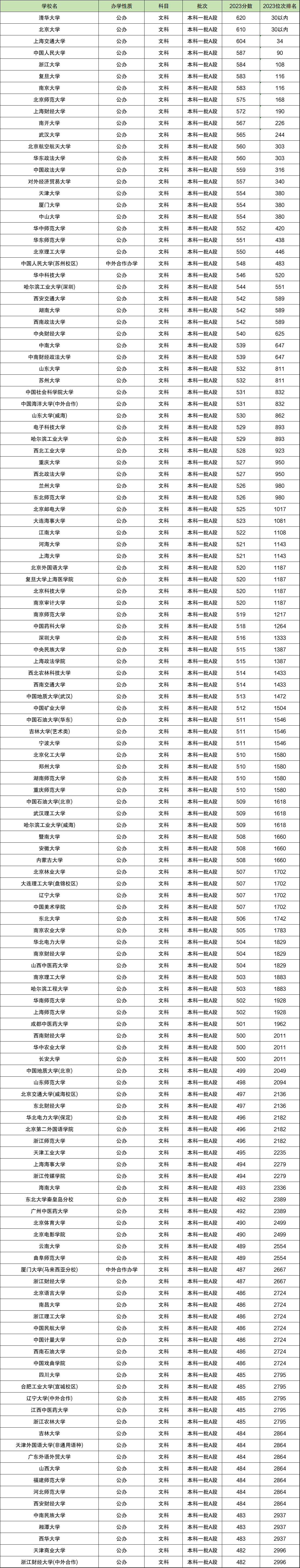 在1-3000名范围内,最高排名对应的大学是清华大学,最低录取排名为30位以内,排名对应分数为620分;