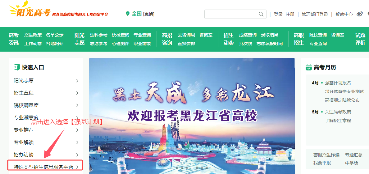 使用电脑浏览器访问阳光高考平台,点击“特殊类型招生信息服务平台”,选择“强基计划”板块,进入报名系统。教育部阳光高考平台官网为: