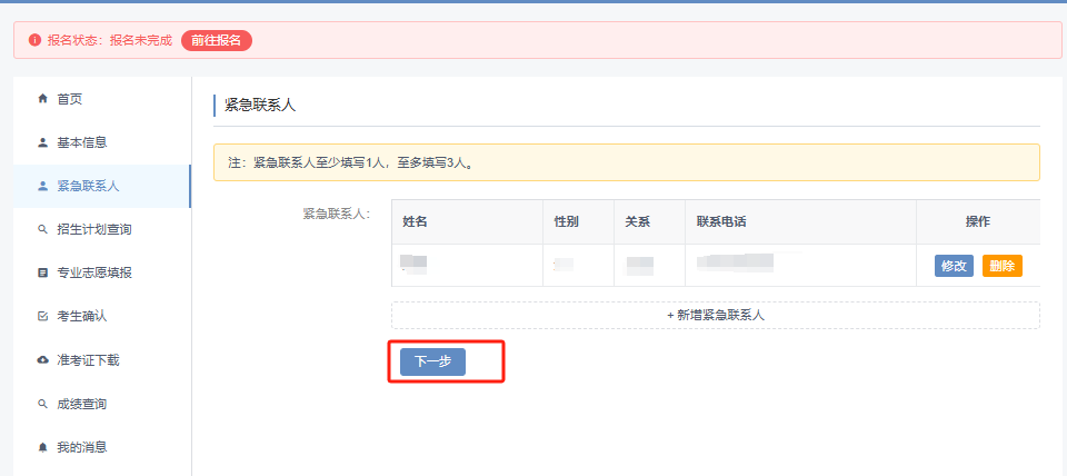 按照系统提示填写紧急联系人信息。至少填写1人,至多填写3人。请务必填写在报名和后续校测期间能够及时联系到的亲属或老师。