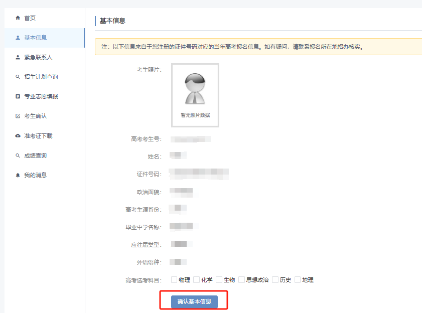 登录后,系统将自动读取您注册证件号码对应的当年高考报名信息,包括高考选考科目等。请仔细核对这些信息是否准确,如有疑问应及时联系报名所在地招办核实。