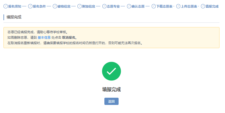 志愿上传完成后,报名即算完成。考生可在报名截止前随时登录系统查看报名状态。请务必注意截止时间,逾期未完成的志愿将视为无效志愿。