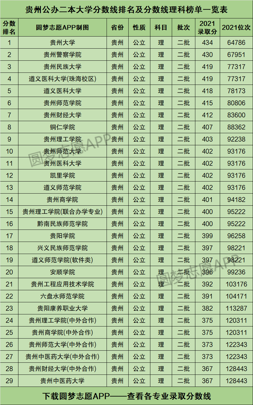 二、贵州公办二本大学排名及分数线理科榜单一览表