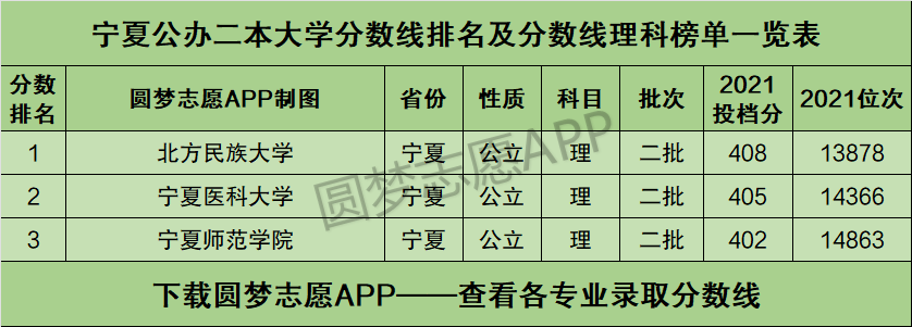 圆梦志愿以各校2021年在宁夏理科的投档分数线的高低为标准进行排名,为大家展示出下图这份宁夏所有公办二本大学的投档分数线排名,大家可以对照着位次看看自己能读宁夏的哪一所公办二本: