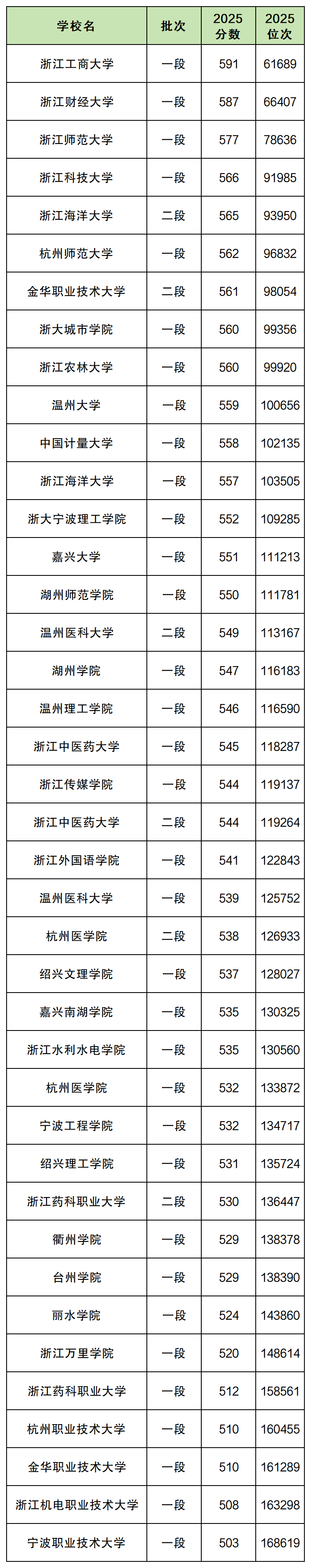 2025年浙江公办二本大学在浙江省内的最低分数线: