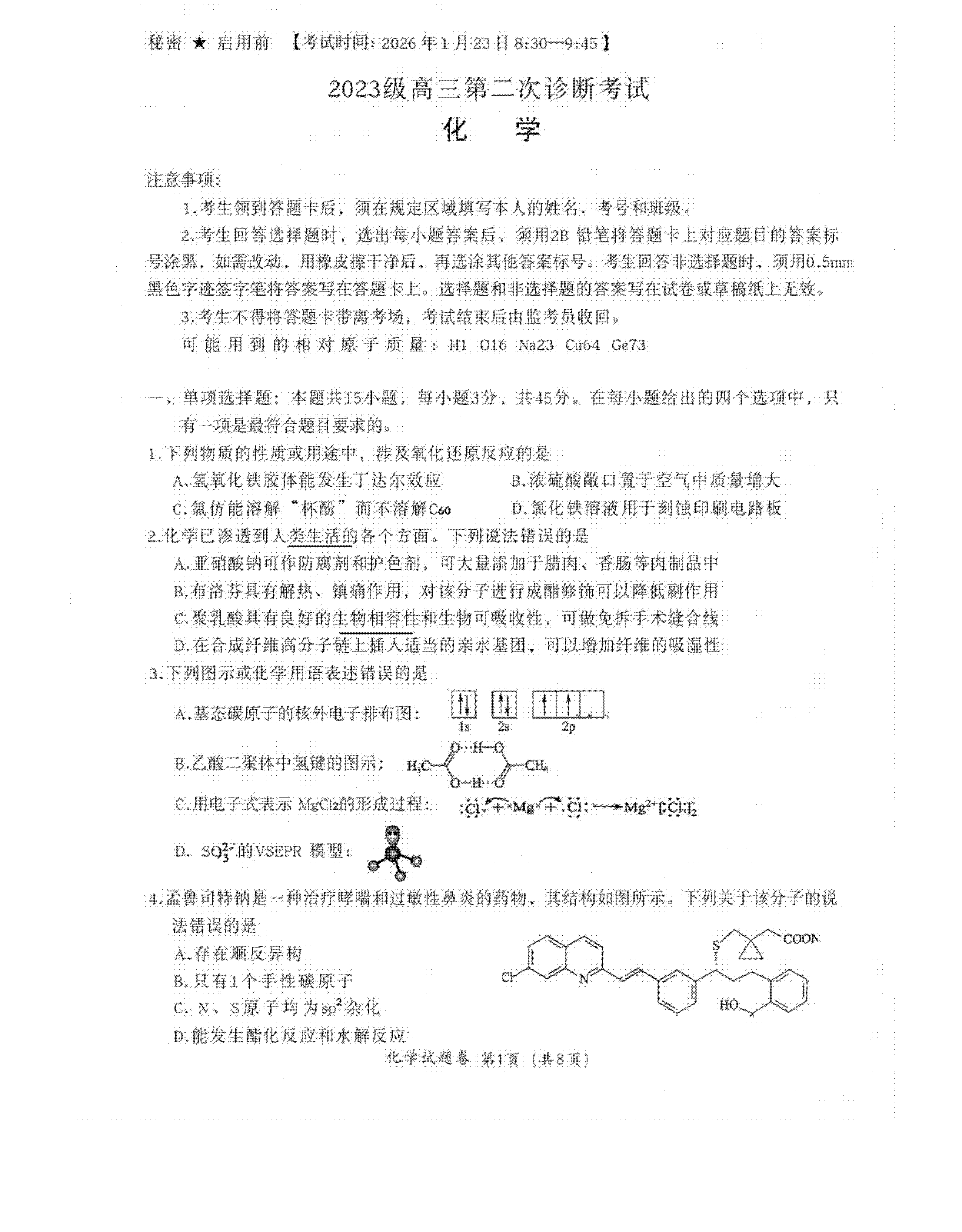 2026届高三绵阳二诊化学考试已于1月23日9:45结束。为帮助同学们及时核对答案、预估分数,本文在考试结束后第一时间收集整理完整版化学试卷与详细答案解析(含A卷、B卷),并在文末附上高考化学答题时间分配与答题规范。