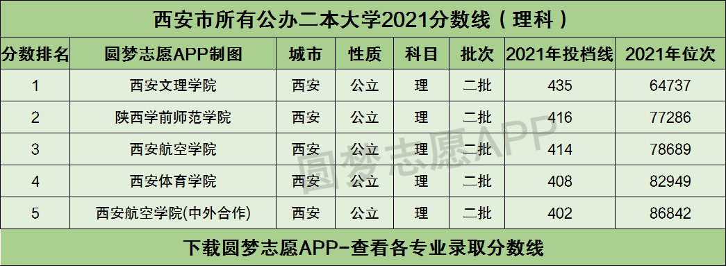 根据下图可知,西安市内的公办二本大学2021年在陕西高考理科的最低分数线为402分,对应的大学为西安航空学院(中外合作)。而陕西省2021年高考理科二本线为341分,这也就意味着如果你想读西安市内的公立二本大学,那么至少得超过二本线61分才行!