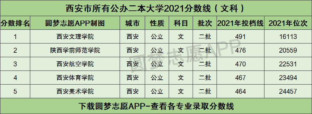 根据下图可知,西安市内的公办二本大学2021年在陕西高考文科的最低分数线为464分,对应的大学为西安美术学院。而陕西省2021年高考文科二本线为406分,这也就意味着如果你想留在西安市内读公立二本大学,那么高考成绩至少要超过二本线58分才行!