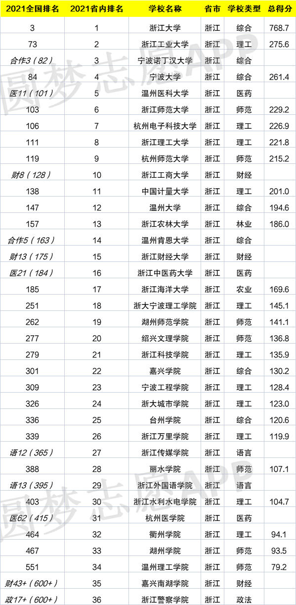 根据软科2021年中国大学排名可知,在浙江省中排名最低的本科大学分别如下,