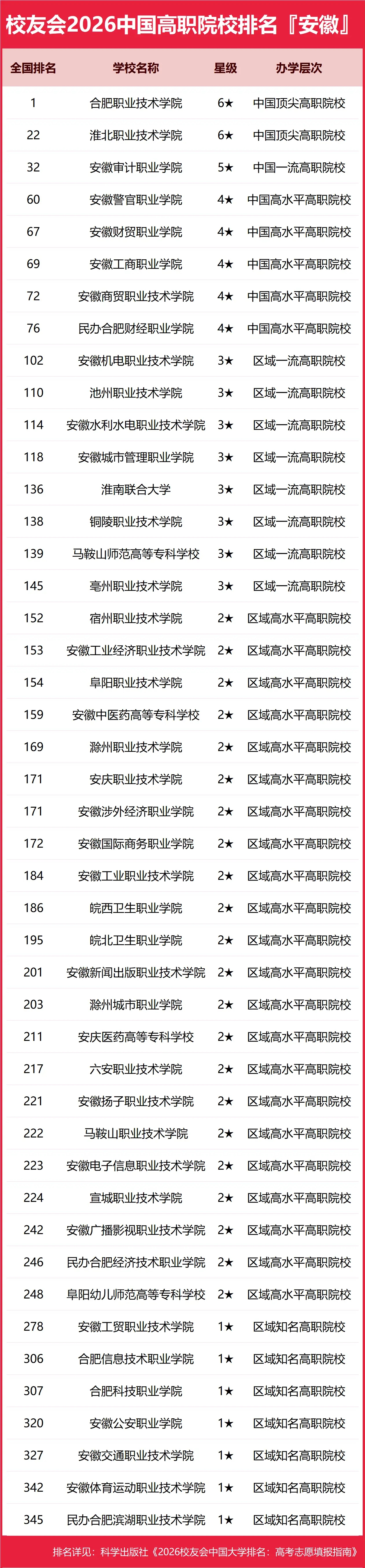 在选择院校时,院校的综合实力排行榜也是考生可参考的因素,本文就参考2026年校友会高职院校排行榜,整理出安徽公办大专院校排名。