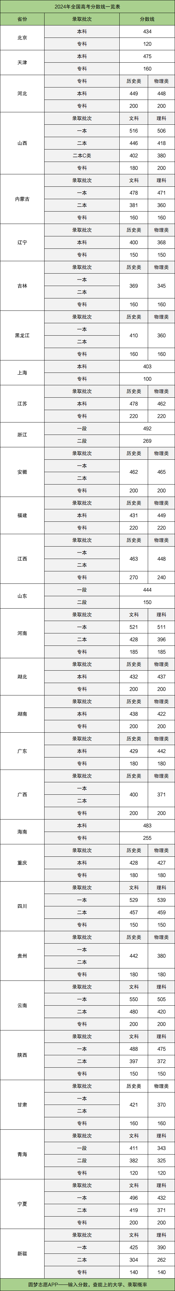 以下是全国各省2024年高考录取分数线汇总,可以作为一个参考,对于四川、河南等过渡省份来说,参考价值会相对较低,但其他省份批次线波动不会太大。