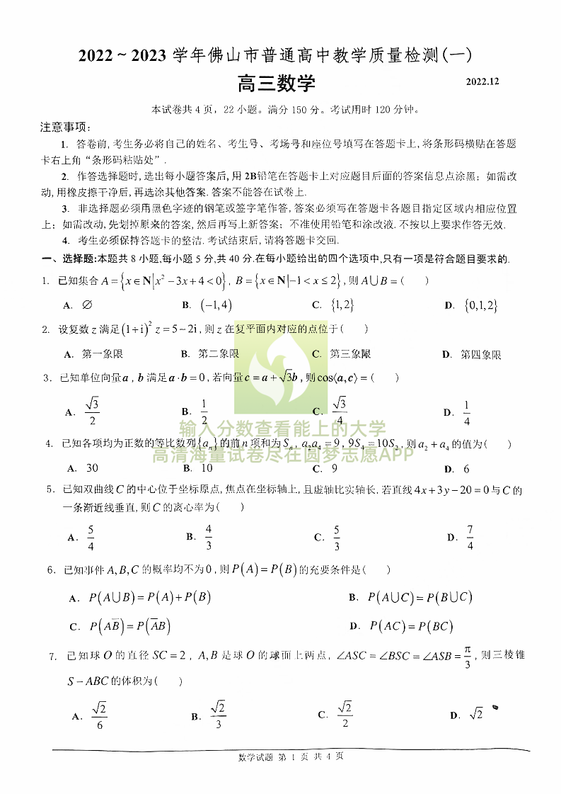 2023佛山一模考试将于2023年2月6日开考,考试结束后本文将更新2023年广东佛山一模考试数学参考答案及试卷,下文为小编搜集整理的2023佛山一模数学试卷及答案,供大家参考。