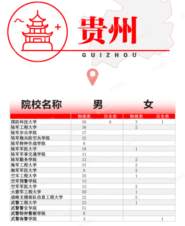 2024年面向贵州招生的军校有19所,包含国防科技大学、陆军工程大学、陆军炮兵防空兵学院、陆军军事交通学院、海军军医大学、空军预警学院、武警工程大学、武警警官学院、武警海警学院。以下是这19所军校在物理类和历史类分别招生的人数,详情如下:
