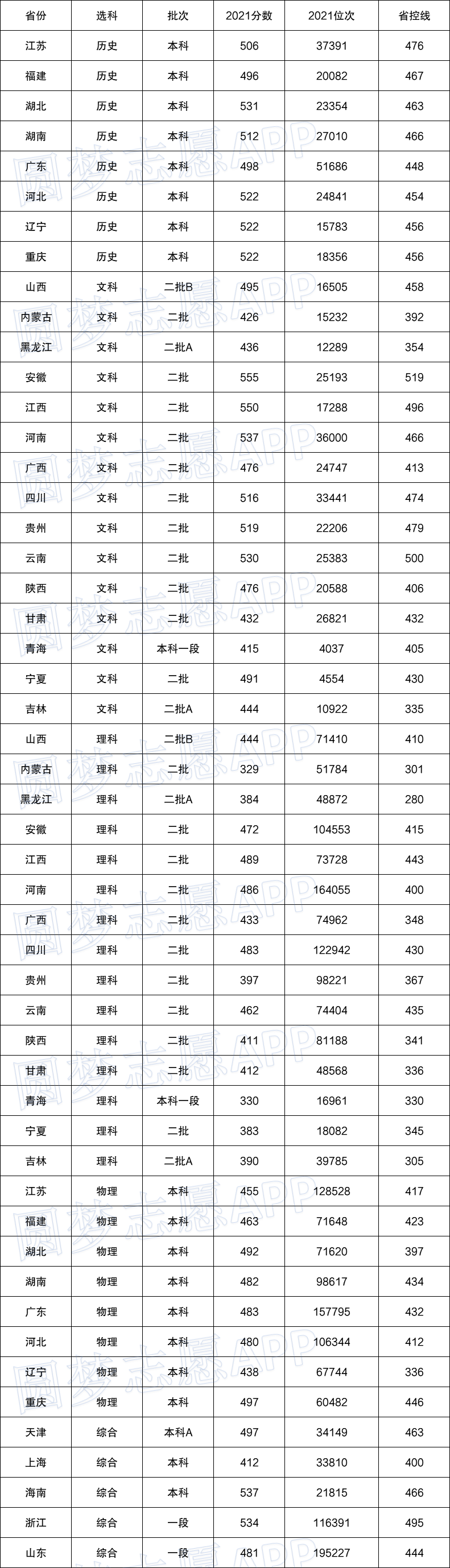 如下图所示,即为河南工程学院2021年在各省市区的最低录取分数线。我们可以看到,大多数的省份的录取分数线都在400分~500分之间,学院在安徽文科的录取分数线最高,达到了555分;学院在内蒙古理科的录取分数线最低,达到了329分。