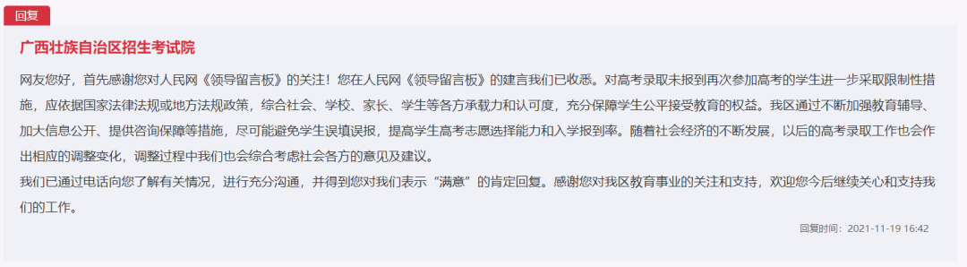 广西壮族自治区招生考试院11月19日回复称,建言已收悉。