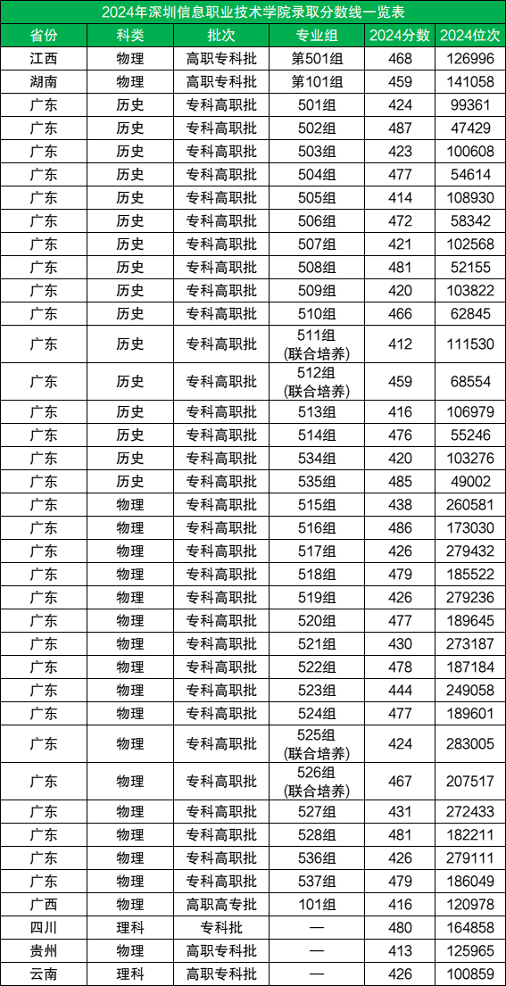 以广东省为例,历史组的最低录取分数线为459分,超本科线31分,物理组的最低录取分数线为467分,超本科线25分。这些数据表明,深圳信息职业技术学院在专科层次的招生中已经具有较高的录取门槛。
