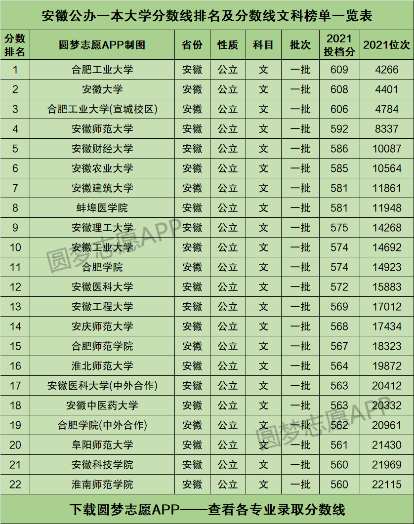 圆梦志愿以各校2021年在安徽文科的投档分数线的高低为标准进行排名,为大家展示出下图这份安徽所有公办一本大学的投档分数线排名,大家可以对照着位次看看自己能读安徽省内的哪一所公办一本: