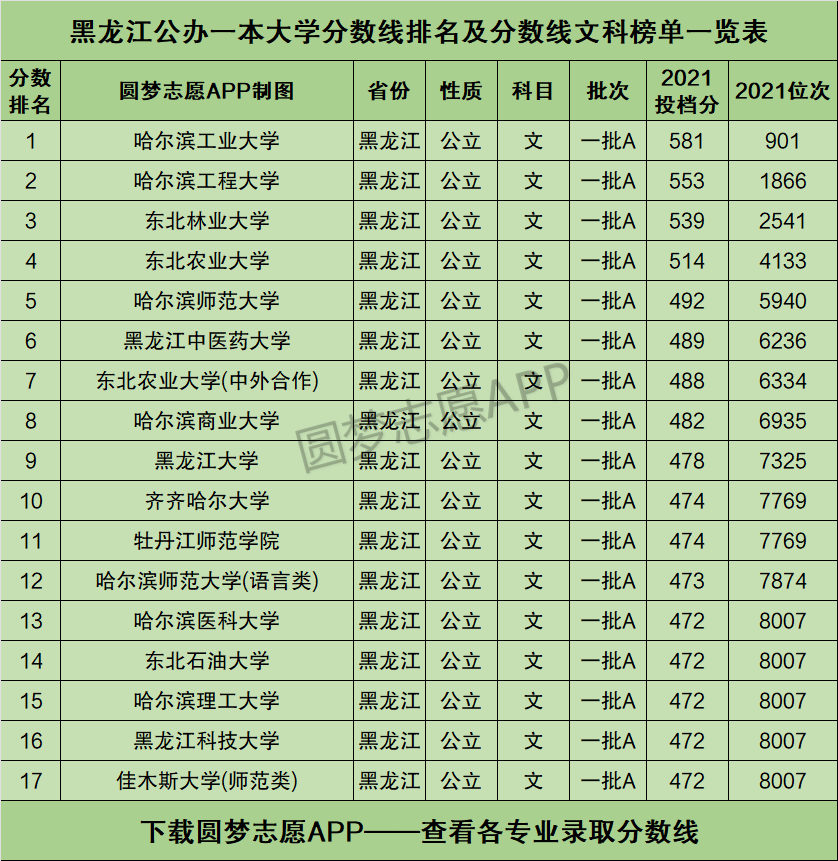 圆梦志愿以各校2021年在黑龙江文科的投档分数线的高低为标准进行排名,为大家展示出下图这份黑龙江所有公办一本大学的投档分数线排名,大家可以对照着位次看看自己能读黑龙江省内的哪一所公办一本: