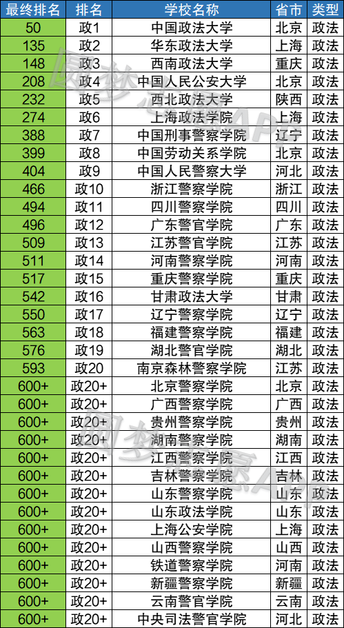 警察类大学也属于政法类大学,因此我们根据2023年软科最新政法类大学排名得知,目前排名靠前的十所大学分别是:
