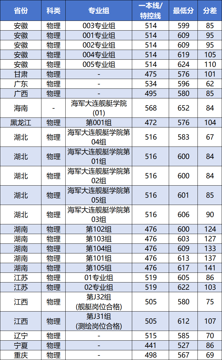 下面是海军大连舰艇学院2025年录取分数线一览表: