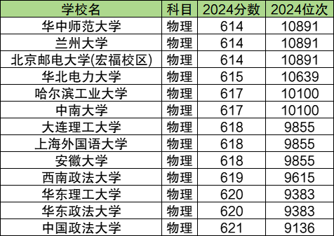 位次在10000左右的基本属于985或实力较强的211院校,分数在614-621分之间,比特招线高162-111分。其中位次相对靠后的有华中师范大学、兰州大学、北京邮电大学(宏福校区)。