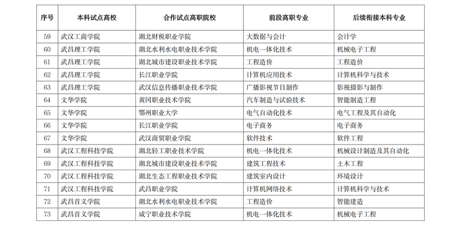 湖北职业技术学院(软件技术),衔接本科院校为湖北工程学院(软件工程);