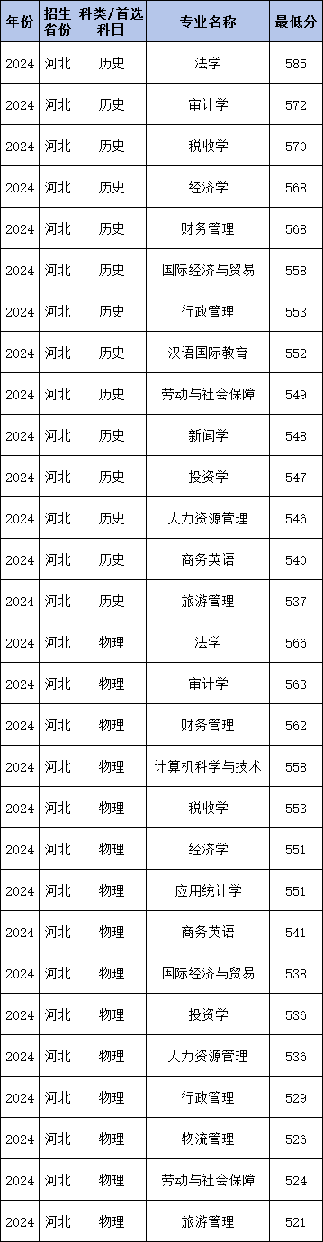 2024年河北经贸大学国家专项计划在河北录取最低分历史类为537分、物理类521分,历史组收分最低的专业为旅游管理、物理组收分最低的专业为旅游管理。