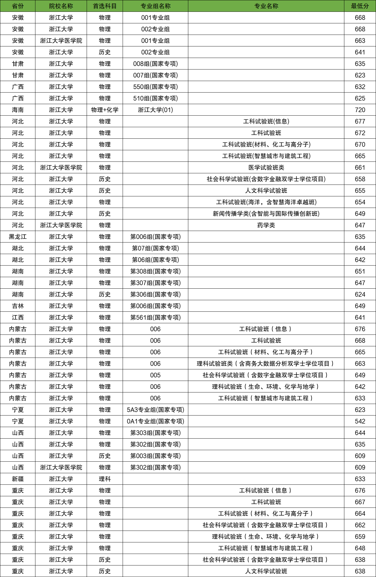 以下为2025年浙江大学本科批部分省份各专业招生分数线。