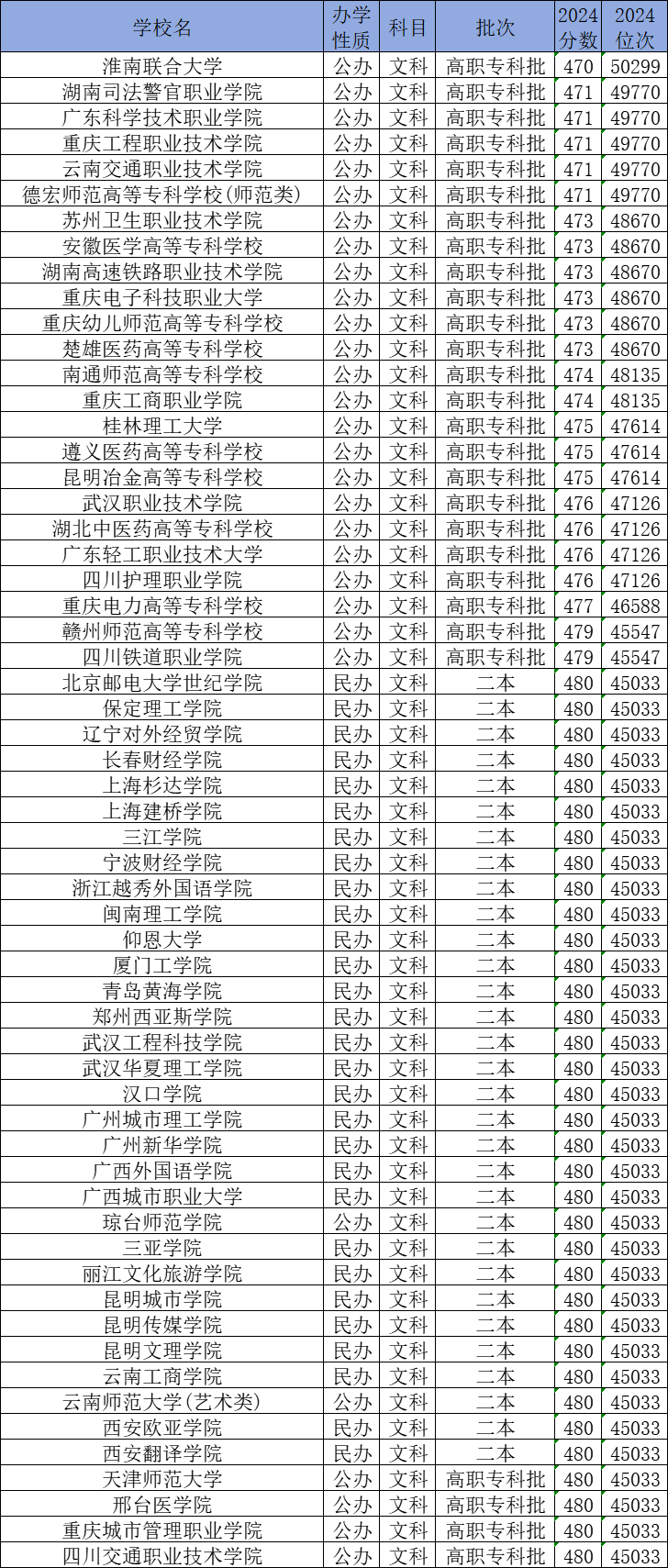 各省470分到480分的大学名单不同,本文以云南省为例,分别整理文科、理科录取分数线位于470-480分的大学。