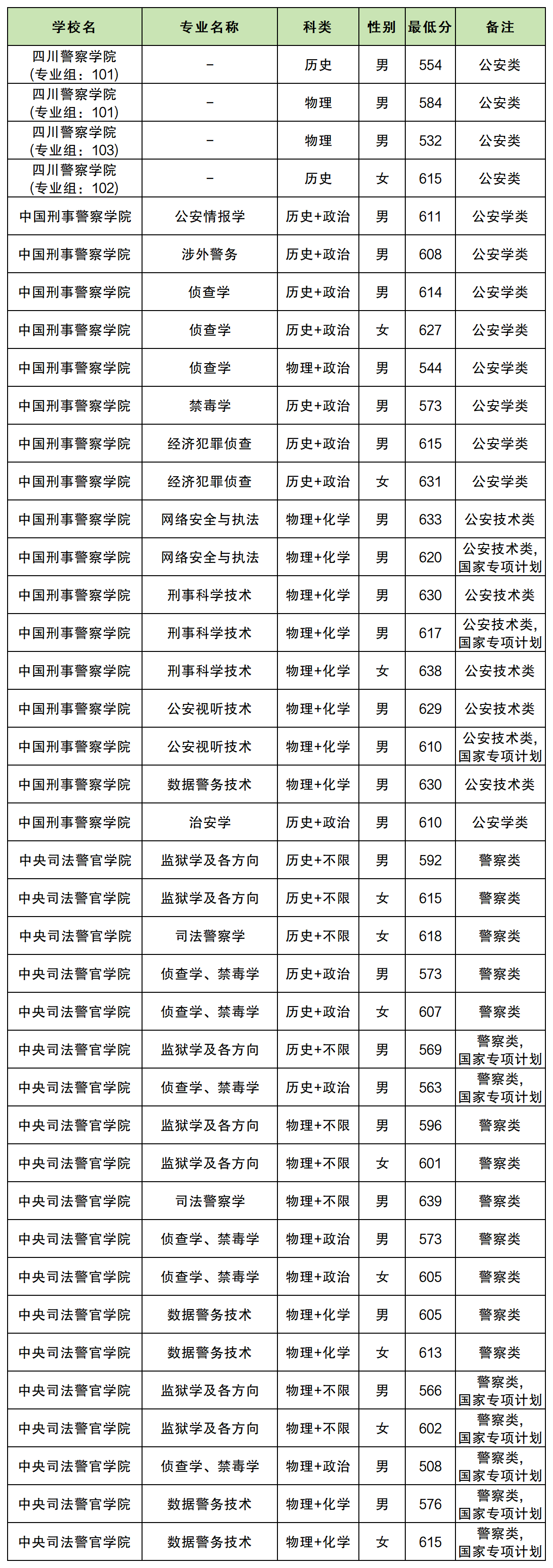 历史类男生最低554分,对应四川警察学院101组;女生最低607分,对应中央司法警官学院侦查学、禁毒学专业。