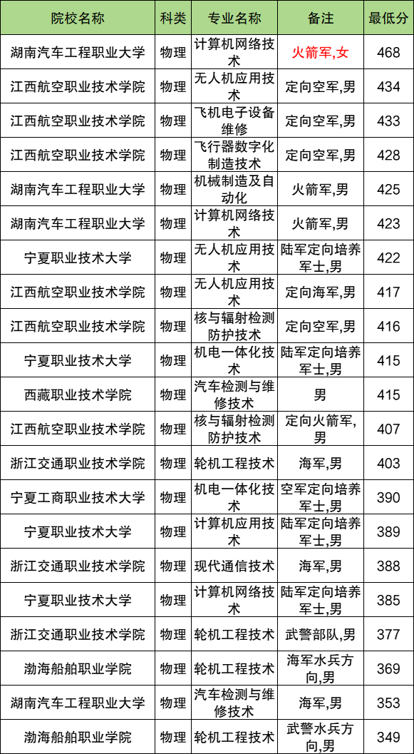 而招生对象为女生的定向士官学校是湖南汽车工程职业大学,最低分为468分,专业是计算机网络技术(火箭军)