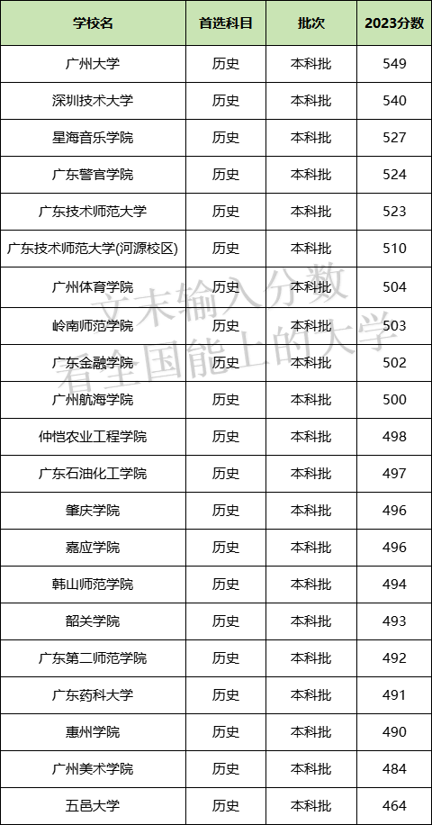广东所有公办二本历史类分数线表