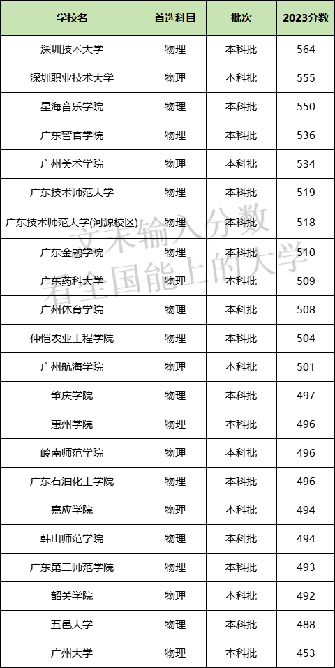 广东所有公办二本物理类分数线表