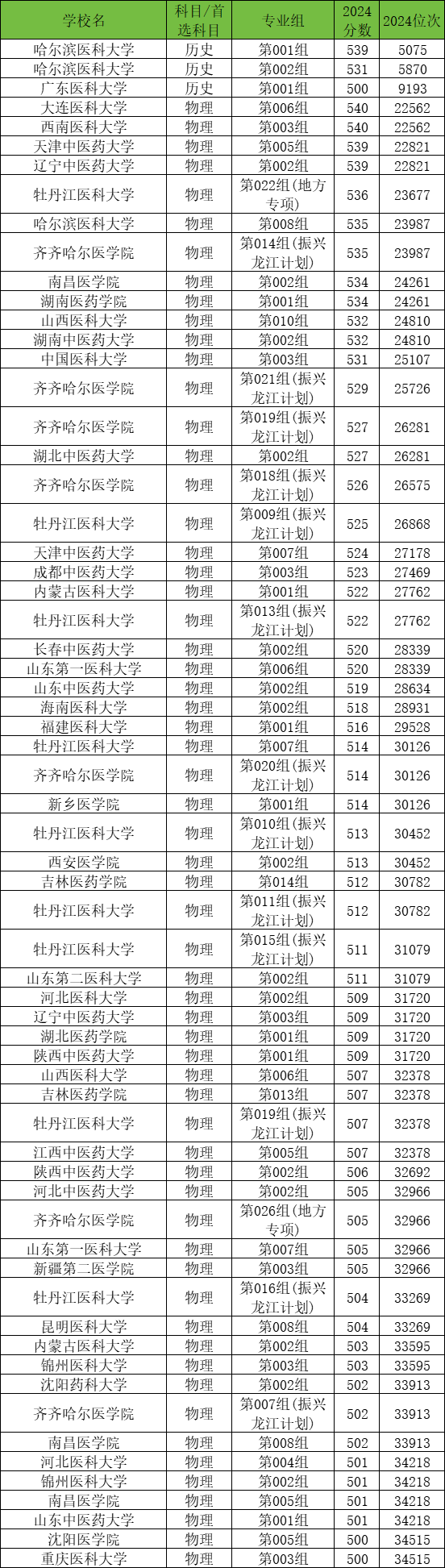2024年在黑龙江招生的所有公办医科大学中,500-540分左右的院校有下列这些:
