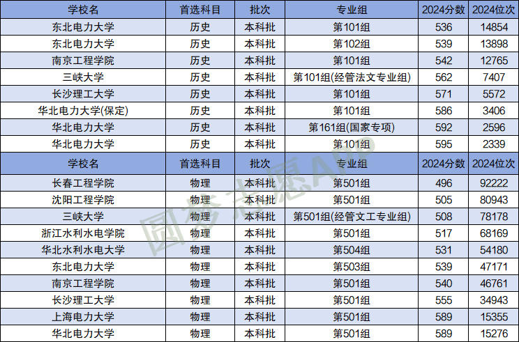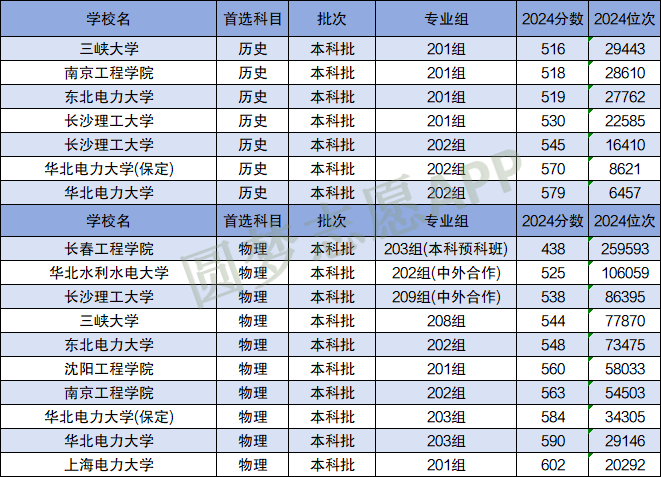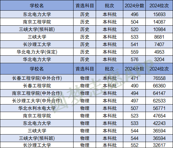 历史类收分最低的电力大学有三峡大学,2024最低分516分;物理类收分最低的长春工程学院,2024最低分438分。可以发现的是超过广东历史类本科线88分,才能上电力大学。