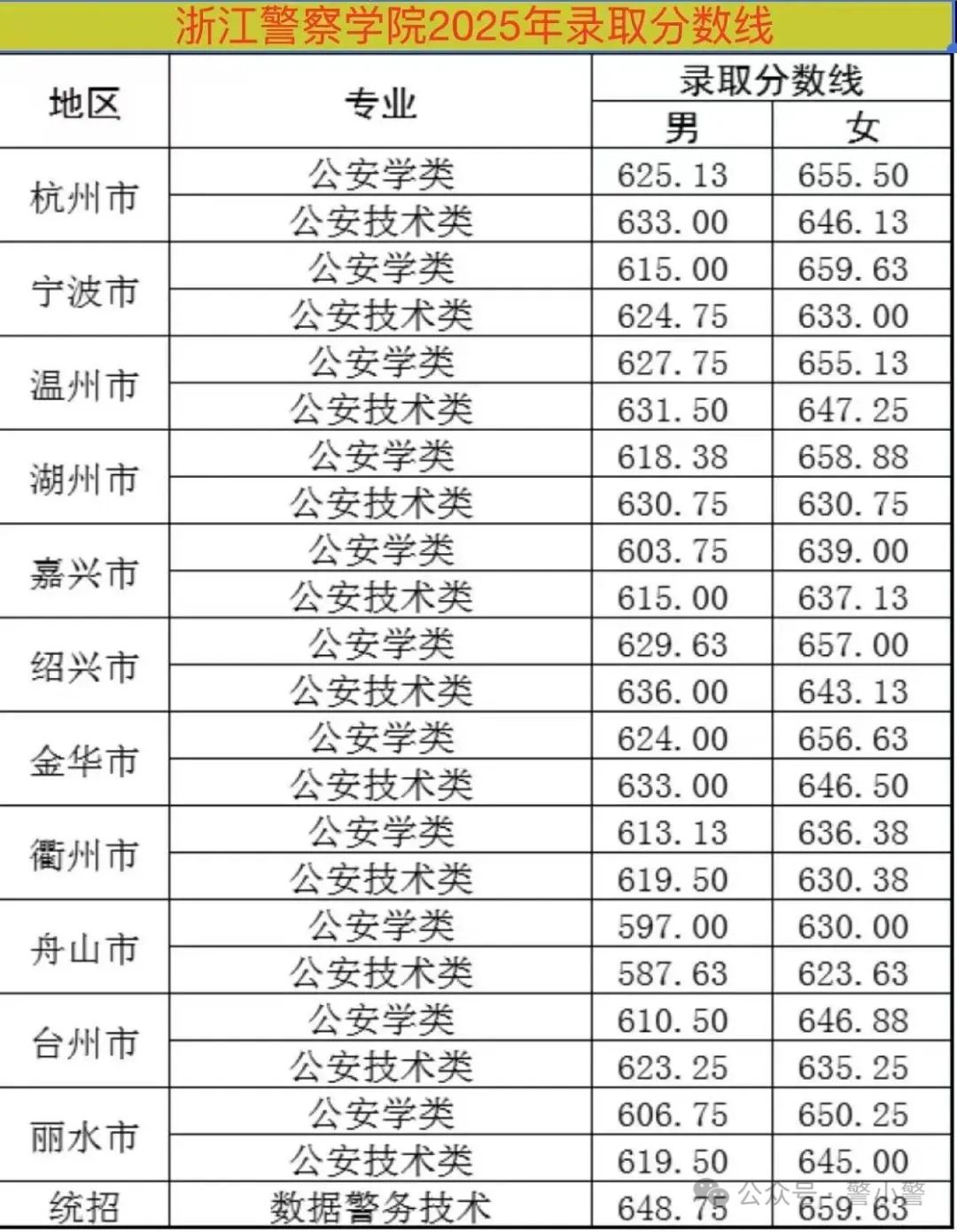 篇幅有限,以下是浙江警察学院2025年在浙江省招生录取最低分情况,供参考: