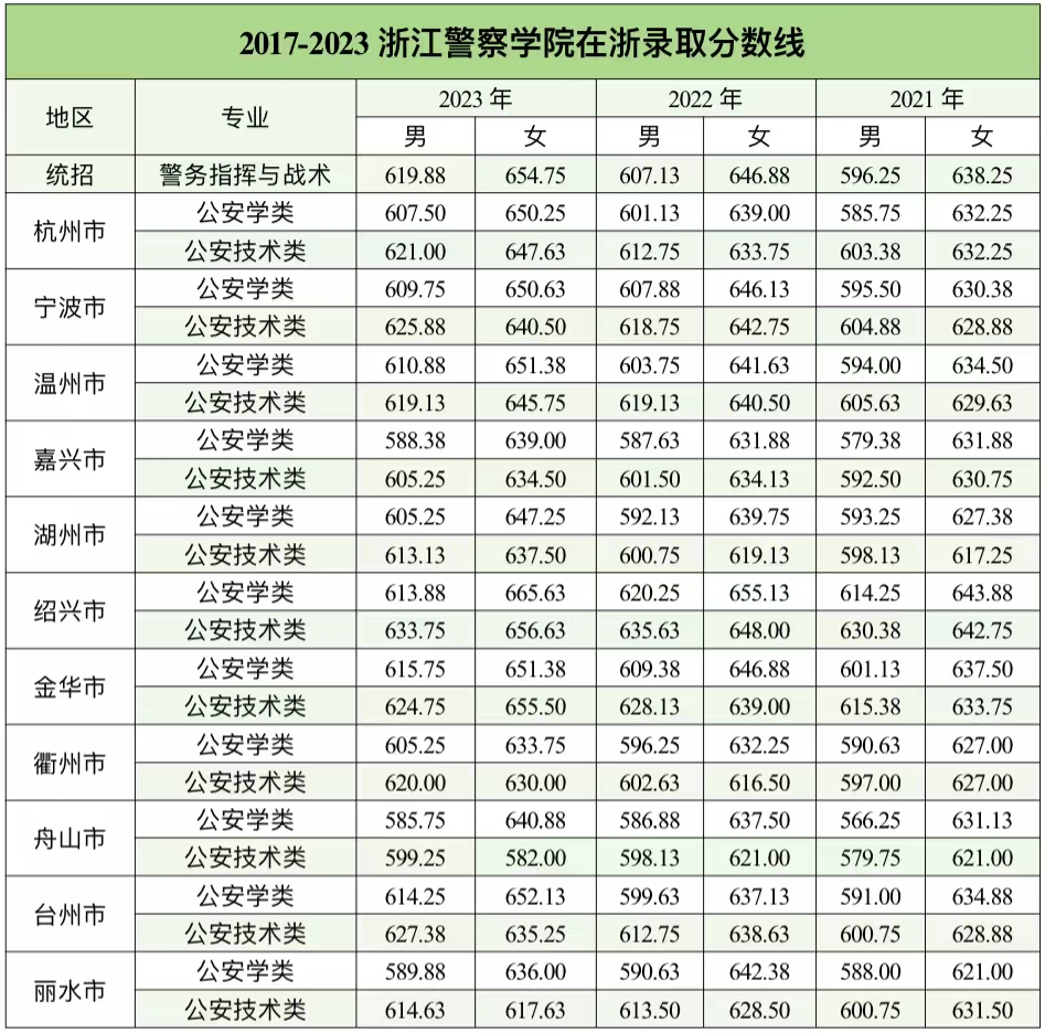 作为我国36所高考招生公安警校之一,浙江警察学院主要在本科批招生。2025年浙江警察学院本科批专业在杭州市招生录取最低分为625.13分,在宁波市招生录取最低分为615分,在温州市招生录取最低分为627.75分。