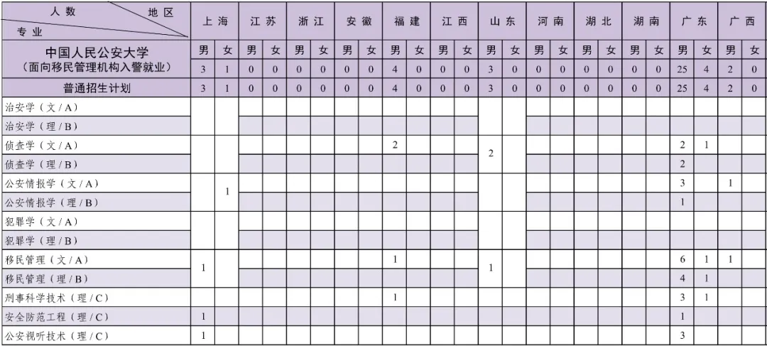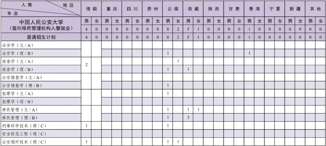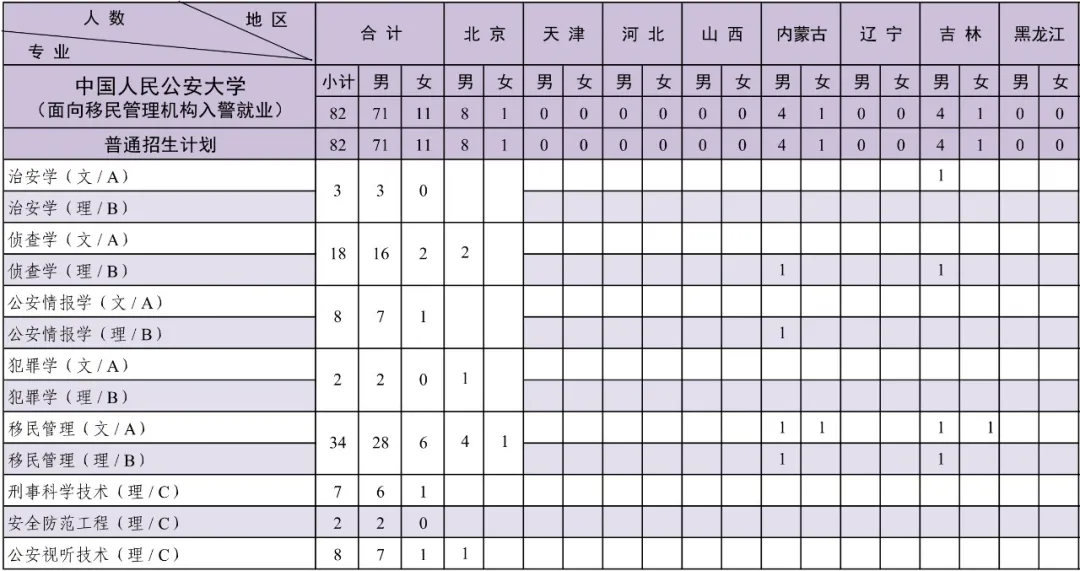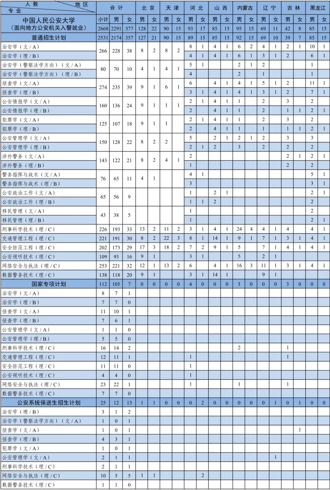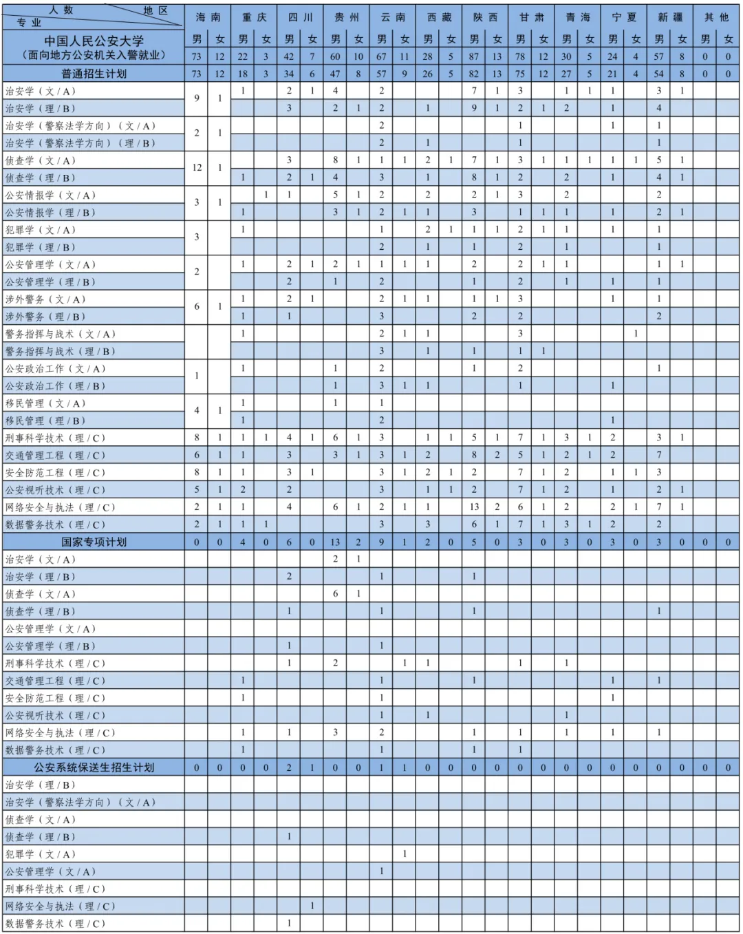 根据教育招生考试院,学校招生计划面向地方公安、铁路公安、首都机场公安局、国家移民管理机构。全国各类招生计划人数如下表: