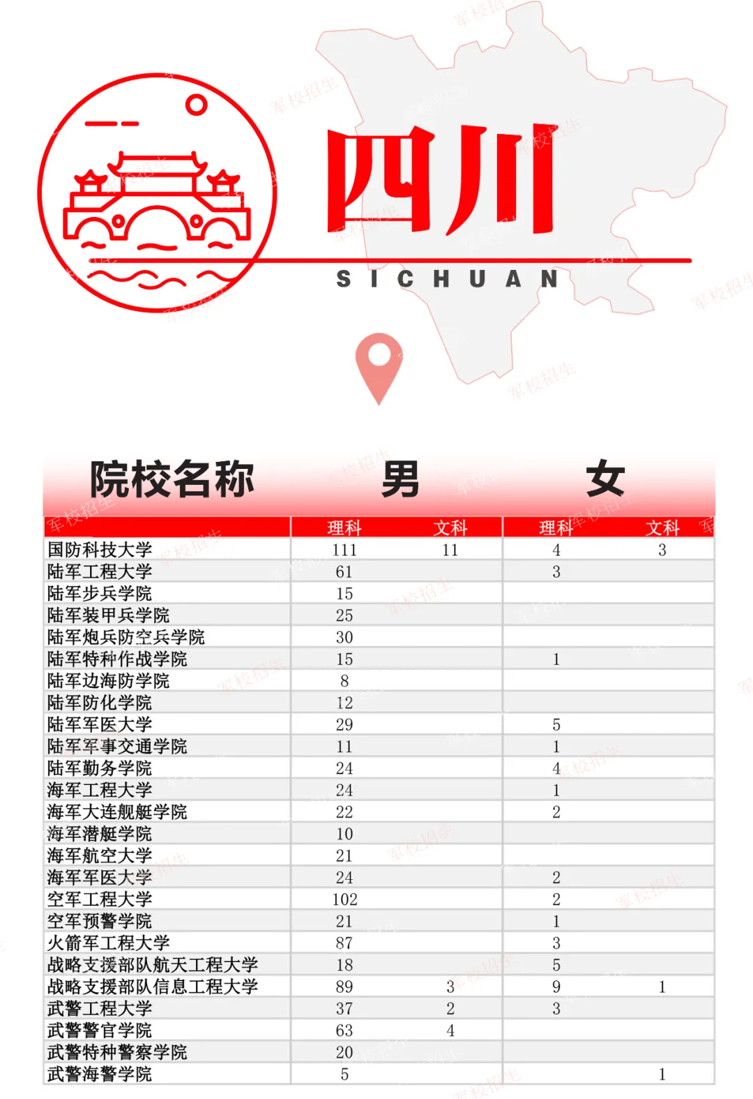 2024年军校在各省的招生人数差距较大,下图展示了在四川招生的军校名单及招生人数,如想了解其他省份信息,可点击下方链接查看。