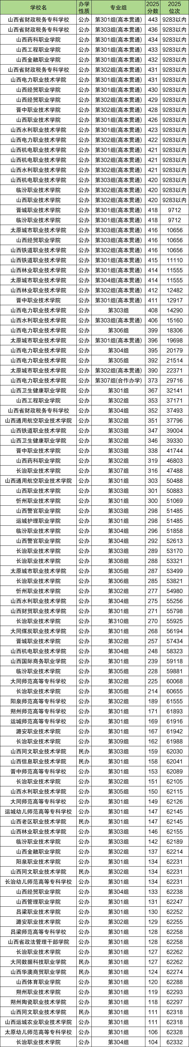 高分段大专院校全部为高本贯通招生,包括山西金融职业学院第001组(466分)、晋中职业技术学院第001组(466分)、山西经贸职业学院第001组(464分)、山西工程职业学院第001组(456分)、山西铁道职业技术学院第001组(447分)等。