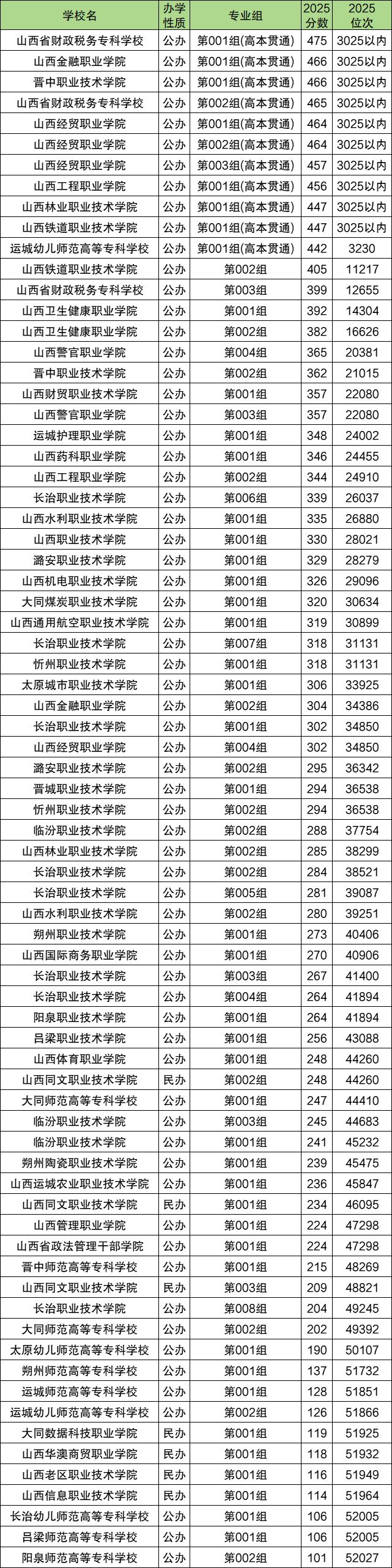 2025年山西公办专科大学排名前十院校为: