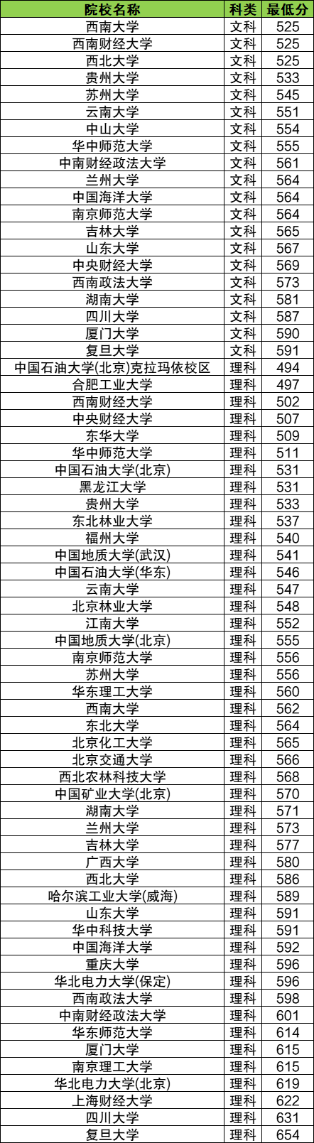 理科招生分数均在494分及以上,最低分院校为中国石油大学(北京)克拉玛依校区(494分);