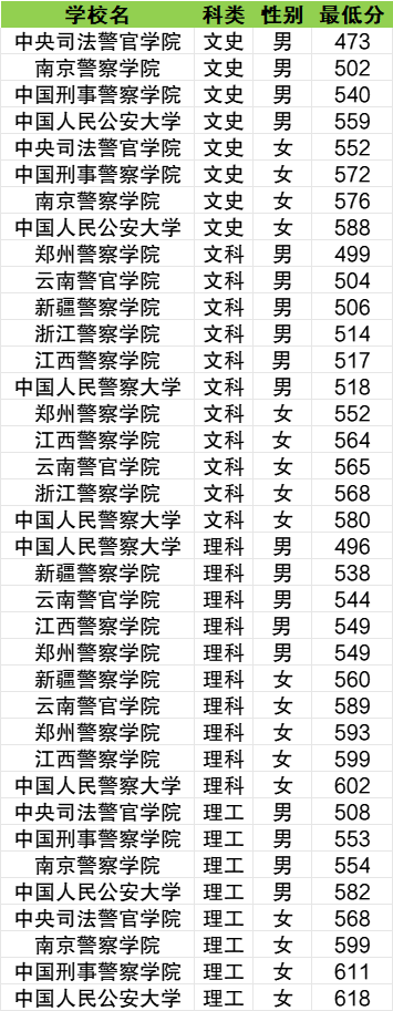 理科招生分数均在496分及以上,女生最低分为560分(新疆警察学院);男生最低分为496分(中国人民警察大学)。