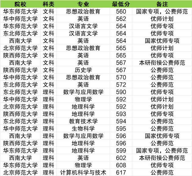 文科招生分数均在560分及以上,最低分院校为华东师范大学(560分),对应最低分招生专业为思想政治教育;