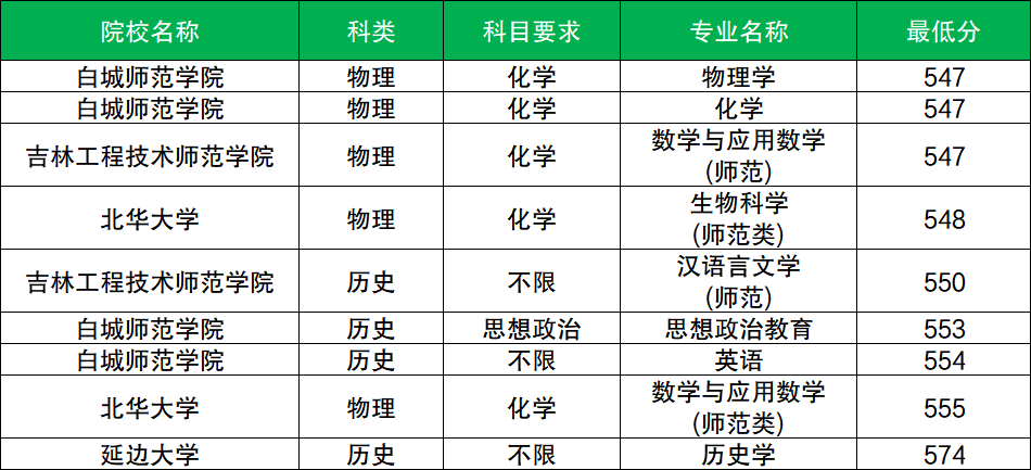 物理类招生专业共计5个,分数在547分到555分不等,最低分专业为白城师范学院物理学、白城师范学院化学、吉林工程技术师范学院数学与应用数学(师范),最高分专业为北华大学数学与应用数学(师范类)。即物理类考生成绩至少超特控线68分才有机会就读省属师范院校公费师范生。
